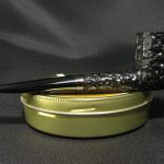 The pipe markings are “OXFORD \ DE LUXE”, “LONDON MADE”. The length is 13.6 cm (5.35″), bowl’s height is 3.9 cm (1.54″). External dimensions of the bowl are 2.6 x 2.8 cm (1.02 x 1.1″), internal diameter is 1.8 cm (0.71″). The depth is 3.4 cm (1.34″) and this pipe weights 26 gr. Briar, vulcanite stem, aluminium stinger.