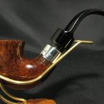 The pipe marking is “PETERSON’S DE LUXE”, “MADE IN THE \ REPUBLIC \ OF IRELAND \ 5S” and “Peterson’s \ DUBLIN”, “STERLING SILVER” and silver hallmarks corresponding to 1990 (an italic “E” letter). The length is 12.8 cm (5.04″), bowl’s height is 4.9 cm (1.93″). External diameter of the bowl is 3.5 cm (1.38″), internal diameter is 1.9 cm (0.75″). The depth is 3.6 cm (1.42″) and this pipe weights 50 gr. Briar, vulcanite stem, aluminium air cooler.